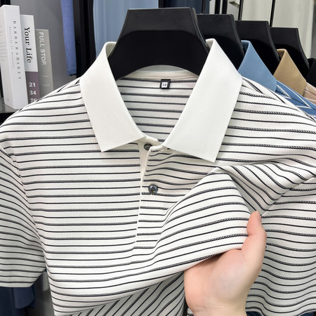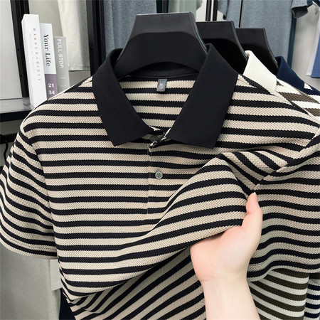 主打款珠地网眼宽条色织对条纹宽松版翻领T恤