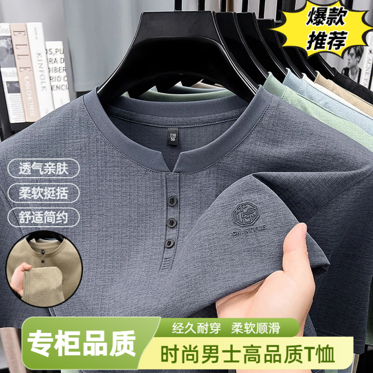 豪琪男装&夏季新款彩棉轻奢亨利领撞色假两件圆领短袖9688款